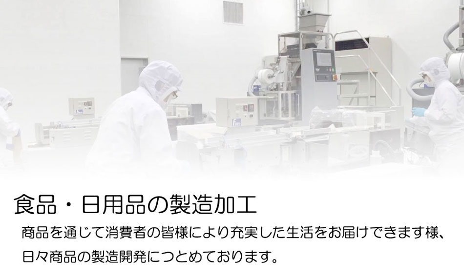 自社工場にて、乾物食品の選別加工製造、衣料用防虫剤、その他日用品の製造をおこなっております。